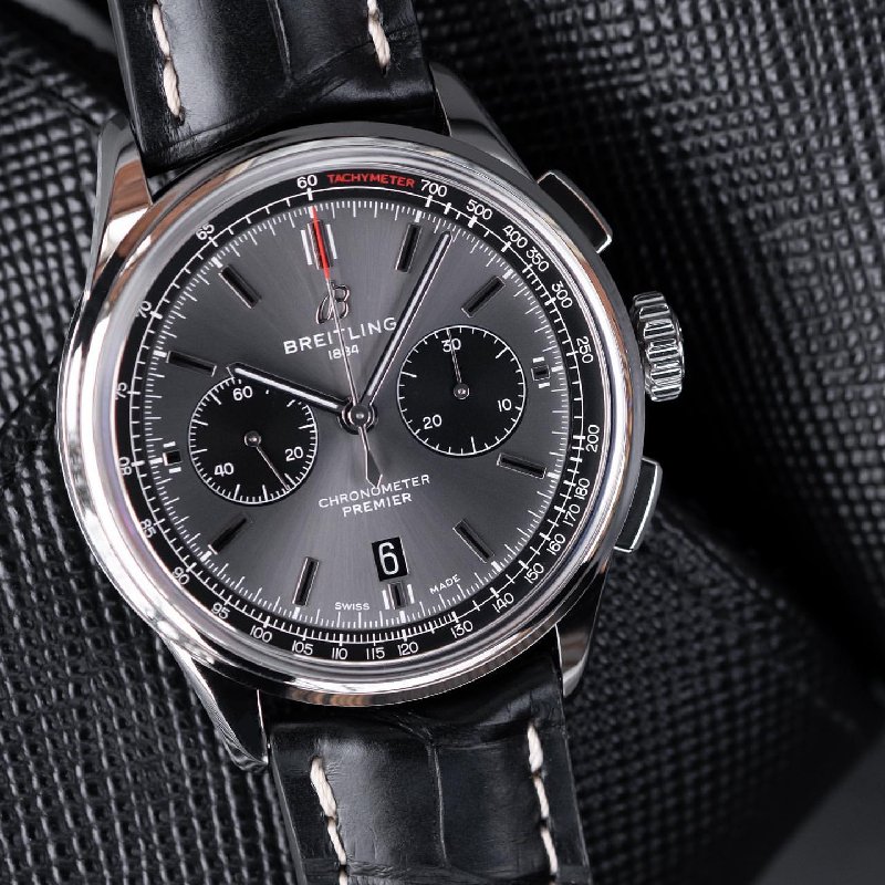 Urban Elegance. A watch that delivers pure style worthy of the Premier legacy. This Premier B01 Chronograph 42 features a sophisticated anthracite dial with contrasting black sub-dials and a white tachymeter scale on a black inner bezel. A transparent case-back reveals the intricate Breitling Manufacture Caliber 01, which offers a power reserve of 70 hours.