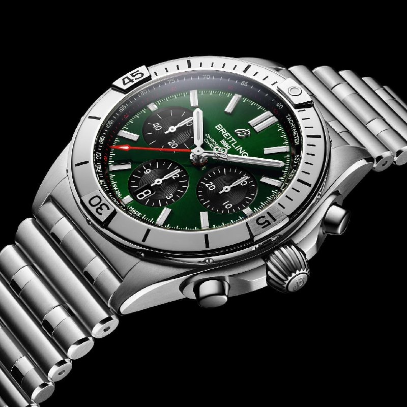 This Breitling Chronomat B01 42 Bentley Edition celebrates the partnership with the great British luxury car brand Bentley Motors. It has a 42 mm steel case with a stunning green dial and black contrasting chronograph counters. This watch, presented on a stainless-steel Rouleaux bracelet with a butterfly clasp, also features a “BENTLEY” engraving around the transparent sapphire case-back
