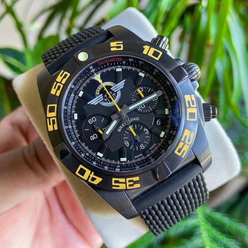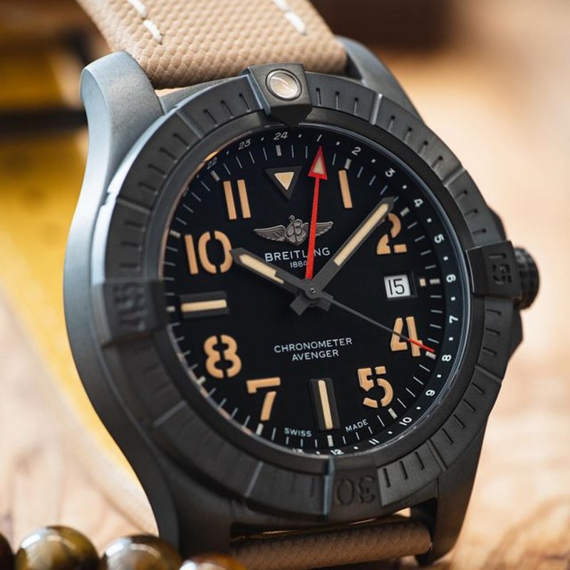 The Breitling Avenger Automatic GMT 45 Night Mission interpretation features a sturdy and lightweight 45mm DLC-coated titanium case, a rugged bezel and an additional red hand indicating a second time zone