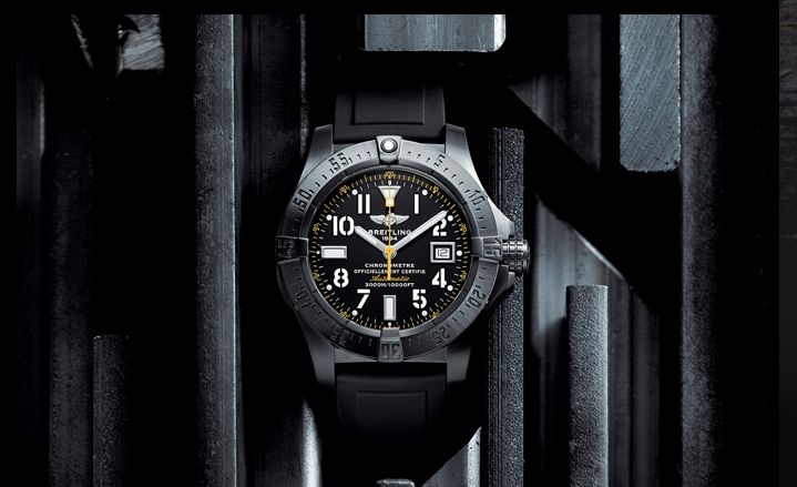 Its name says it all. Avenger for its power and its unfailing sturdiness. Seawolf for water resistance to the fabulous depth of 3,000 meters (10,000 ft). Blacksteel for the black case achieved by a highly resistant carbon-based treatment. And Code Yellow for the extremely original touches of yellow enlivening the seconds hand, the inner bezel, and the Automatic inscription on the dial. With this 1,000-piece limited edition, Breitling has created an exceptional instrument matching peerless performances with an unusual appearance. Born to face up to the most extreme conditions, this professional diver's watch has what it takes to accompany toplevel feats in deep waters. An ergonomic case sporting a design based on digital simulations. A unidirectional rotating bezel. A large screw-locked crown with non-slip grip, protected by substantial lateral reinforcements. An ultra-readable dial with oversized hands and large luminescent accents. A thick sapphire crystal glareproofed on both sides. A security valve serving to balance out the differences between the case exterior and interior. The ultra-sporty and ultracontemporary design is enhanced by highly original stencil-type numerals – echoing Breitling aeronautical vocation – and by a rubber strap. Inside this allblack super-diving model beats a mechanical selfwinding movement that is officially chronometer-certified – like all Breitling movements. Avenger Seawolf Blacksteel Code Yellow: power in action.