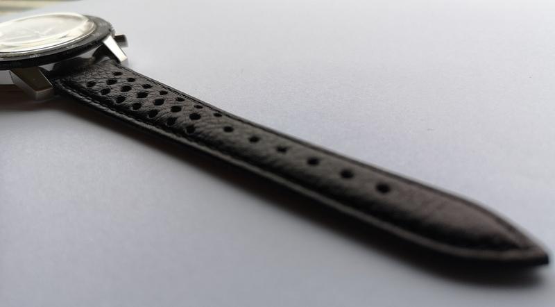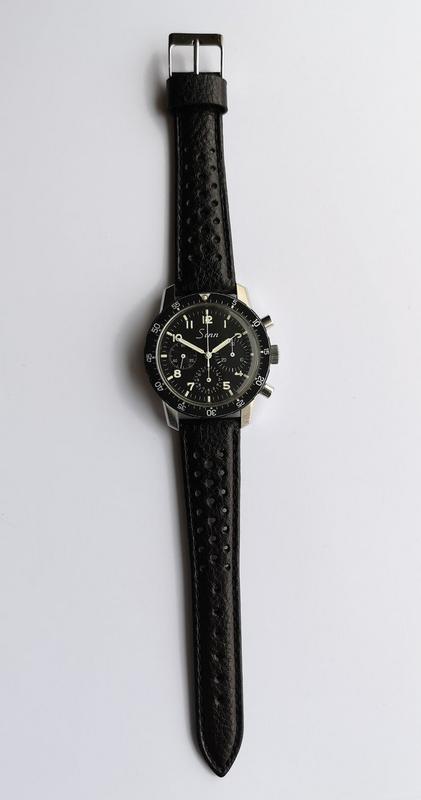 The matte black dial has and luminous Arabics and hands. Finely grooved white counters that have been hollowed out to make them recessed.