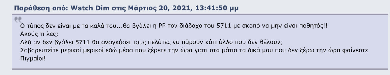 Λοιπόν,ξεκαβάλα λιγάκι,να έχεις λιγότερη έπαρση και να είσαι πιο ευγενικός,γιατί άλλο το να εχεις λεφτα και να αγοράζεις ρολόγια και άλλο το να γνωρίζεις και να κατανοείς το χώρο. Ναυτίλος ατσάλινος,2.5χρόνια plus  μετά,στη θέση του 5711 ακόμα δεν έχει βγει.Όποτε εκ του αποτελέσματος έχω πλήρως επιβεβαιωθεί,γιατί όταν λέω κάτι ξέρω ακριβώς τι λέω.Σε λευκό χρυσό βγήκε,το 5811. Σε μη ευγενές μέταλλο,ακομα οχι. Θα βγει ομως.Και αυριο να βγει πλέον δεν αναιρεί το γεγονος αυτού που είχα πει.Μετά από 2.5 χρόνια στο ξαναλεω,έχω απολυτως επιβεβαιωθεί. Αντιθέτως τα τελευταία δυο χρόνια η Patek,ακριβώς όπως είχα πει,προώθησε άλλες σειρές.