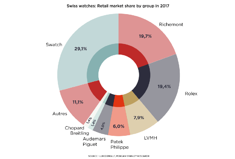 Swatch Group, Rolex, and the watch brands at LVMH and Richemont account for three-quarters of Swiss watch sales, according to a new report by Morgan Stanley which shows how big a slice of the cake the main brands are taking.