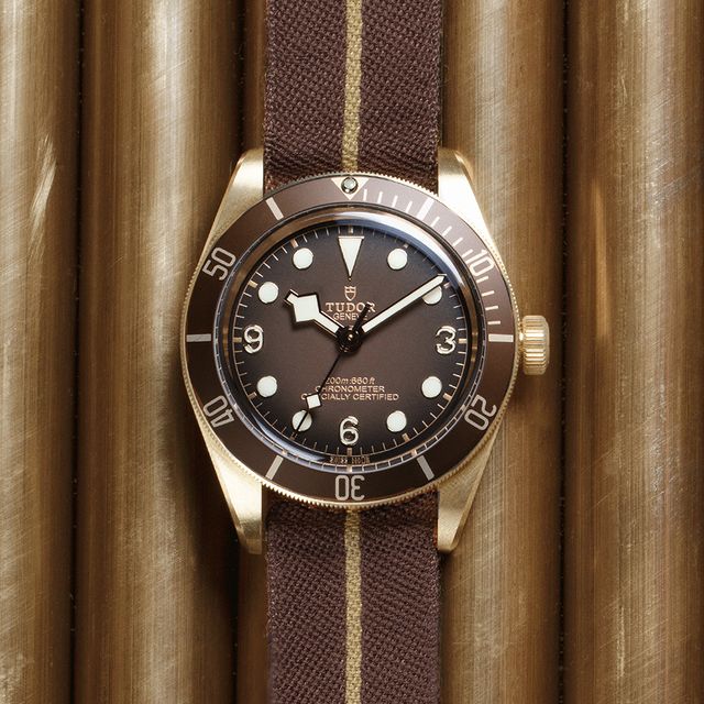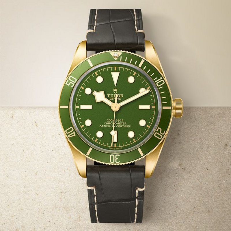 Bold and gold. TUDOR's first gold dive watch, the #TudorBlackBay FiftyEight 18K, makes a big impression enrobed in this precious metal. Completed with two complimentary straps in dark brown alligator and green jacquard fabric