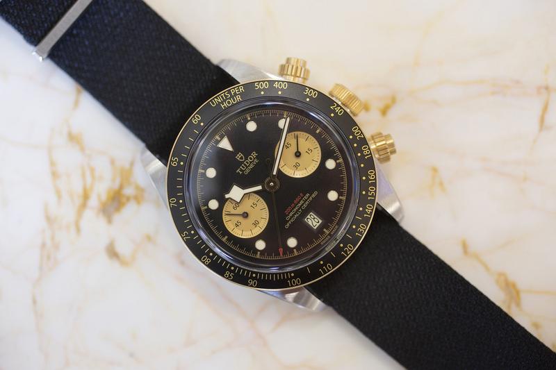 Movement is the Swiss automatic Tudor in-house caliber MT5601 with 25 jewels, 28,800 vph and a power reserve of 70 hours. It features a silicon balance spring and a variable inertia balance on a traversing bridge with a two-point fixation. It is COSC-certified as a chronometer. Its openwork rotor is satin-brushed with sand-blasted details, and its bridges and plate have alternating polished sand-blasted surfaces and laser decorations.