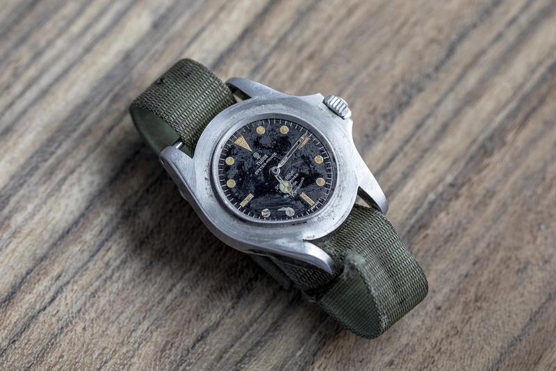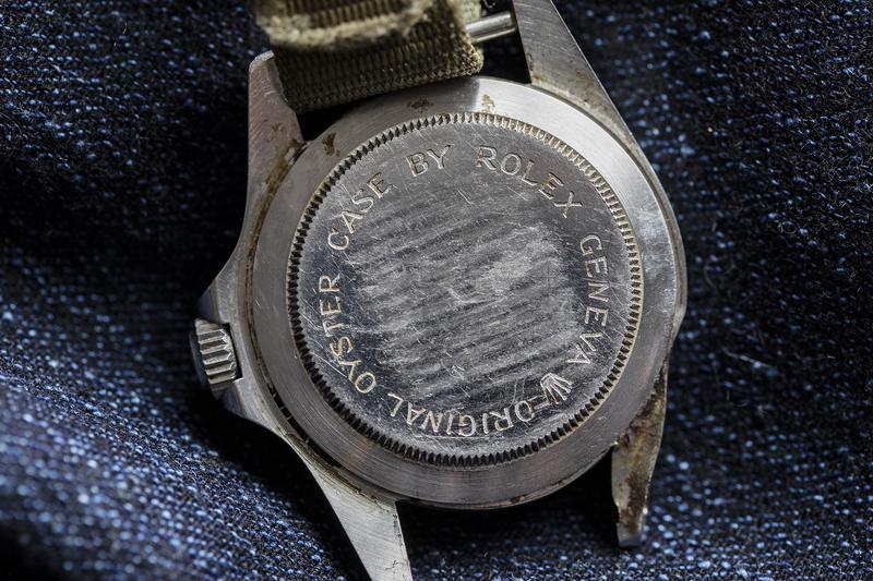 The Tudor Submariner today, showing the damage from a bullet in August 1968: the bottom left lug is dented from impact; the case is misshapen; the crystal and bezel are long gone; and the hands are seemingly fused to the dial