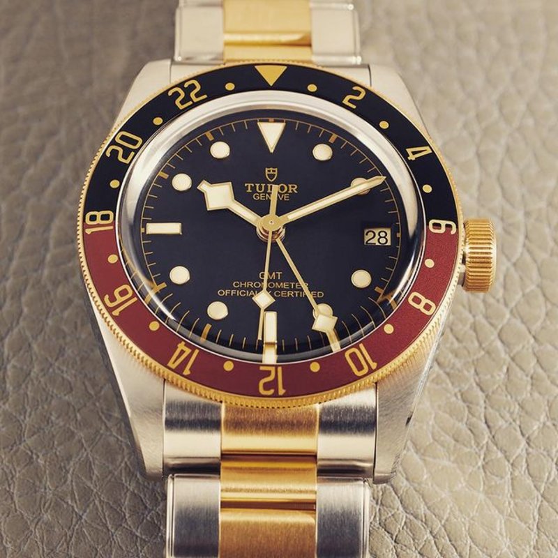 TUDOR Black Bay GMT, Size 41 mm steel case with steel and yellow gold bracelet, Bidirectional rotating bezel in yellow gold with 24-hours graduated matt brown and black aluminium disc. - Domed sapphire crystal. - Manufacture Calibre (COSC). - Power reserve approximately 70 hours. - Waterproof to 200 m. - Five year International Warranty.