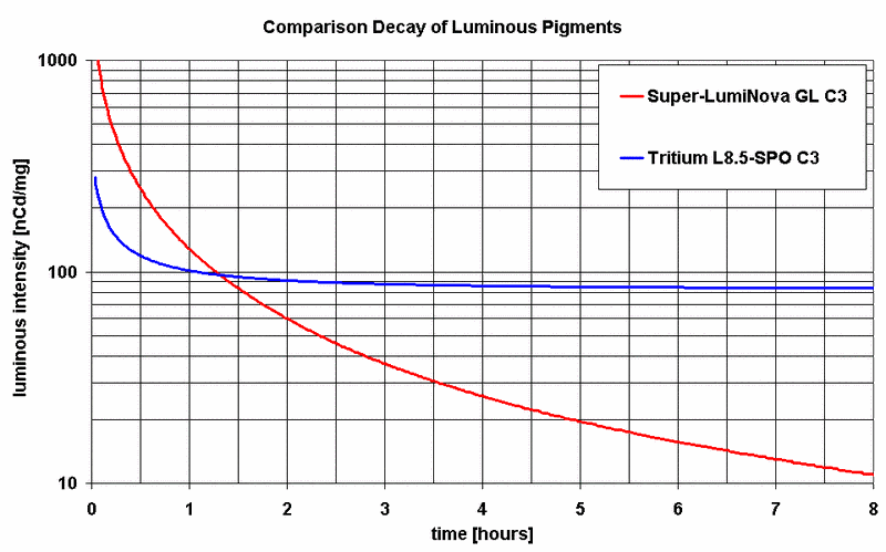 As you can see, Luminova will be brighter initially but decays faster, approaching zero lume asymptotically. OTOH, tritium lume doesn't 'charge' as well but never decays to zero (in practical terms) since it has its own activation source.