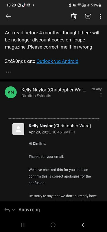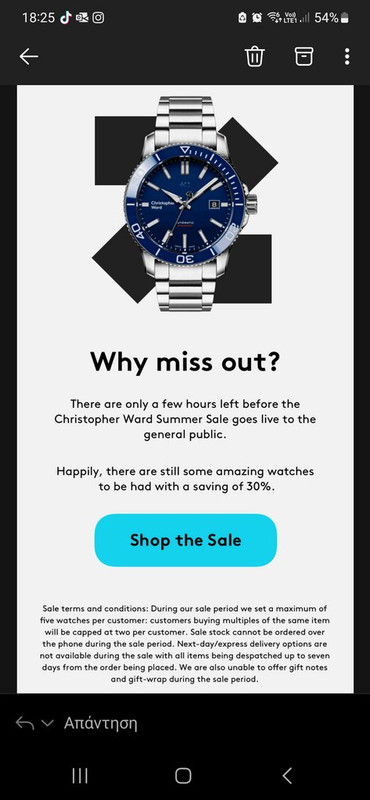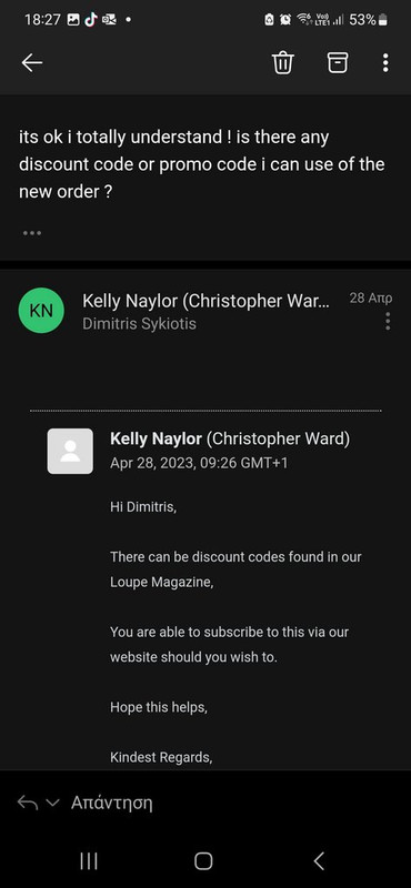Παλια δινανε αρκετα promo Code με εκπτωση και αν εκανες  και sub στο Loupe Magazine ειχε  και καποια extra .Δεν μπορεσα να βρω ολα τα mail αλλα το καθεστος εχει οτι μεσα στο καλοκαιρι οπως μου ειχανε πει και εγινε  θα εχει ενα cleanance promo οπου κομματια που ειναι σε stock θα μπενουν σε ενα 30 % οπως θα δειτε και στη φωτο του mail.Τωρα καποιοι ειχαμε early access , ηταν οσοι εχουμε αγορασει  η οσοι ειμαστε γραμενοι στο loupe η και τα 2 δεν ξερω να σας πω ! Επισης το 10 % discount στο first order  ισχυει εγω ετσι πηρα τουλαχιστον το μαιο !Και καθε τοσο στο σιτε τους παιζει ενα extra category  που βαζουν καποια ρολογια σε stock σε εκπτωση  απο 10 % εως 30%. Αν ενδιαφερεσαι να αγορασεις εγω στο προτεινο και λογο ποιοτητας και λογο after sale απο την εταιρια , απαντανε σε οτι θες αμεσα ειναι φοβερα εξυπηρετικοι ! Εγω εχω το C65 και το Trident  , εχω παρει επισης λουρακι δερμα και σιλιονης τα καινουρια που εβγαλε τωρα το καλοκαιρι!