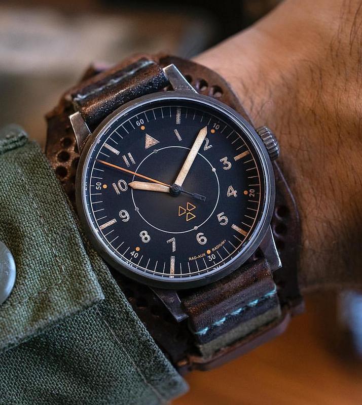The watch is manufactured and hand-aged in Pforzheim Germany, containing a high-grade Swiss movement. All other components, including the box, strap and various artifacts that accompany it, are manufactured within North America.