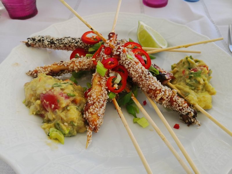 1. Χταποδι σουβλακι ψητο, με τεριγιακι σως και σουσαμι + γουακαμολε