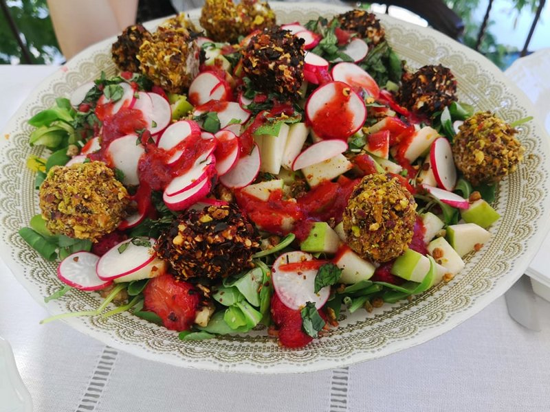 4. Σαλατα σπανακι, βαλεριανα καπαροφυλλα, με φραουλα, ξινομηλο, καρυδι, και μπαλακια τυρι κρεμα με φιστικι/ μπουκοβο +βινεγκρετ φραουλα.
