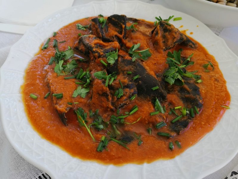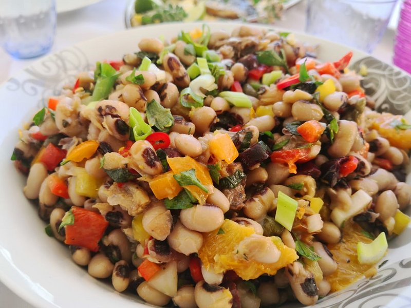 3. Μαυροματικα με καπνιστο σκουμπρι, πορτοκαλι, πιπεριες, τσιλι, βασιλικο , κρεμμυδι, καπαρη, ελια + βινεγκρετ πορτοκαλι