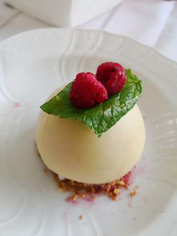 6. Μπαλα λευκης σοκολατας, με "γεμιση" κραμπλ μπισκοτο-φουντουκι, παγωτο μαστιχα χιου, κουλι φρουτα του δασους, που τη "λιωνεις" με γκανας λευκης σοκολατας