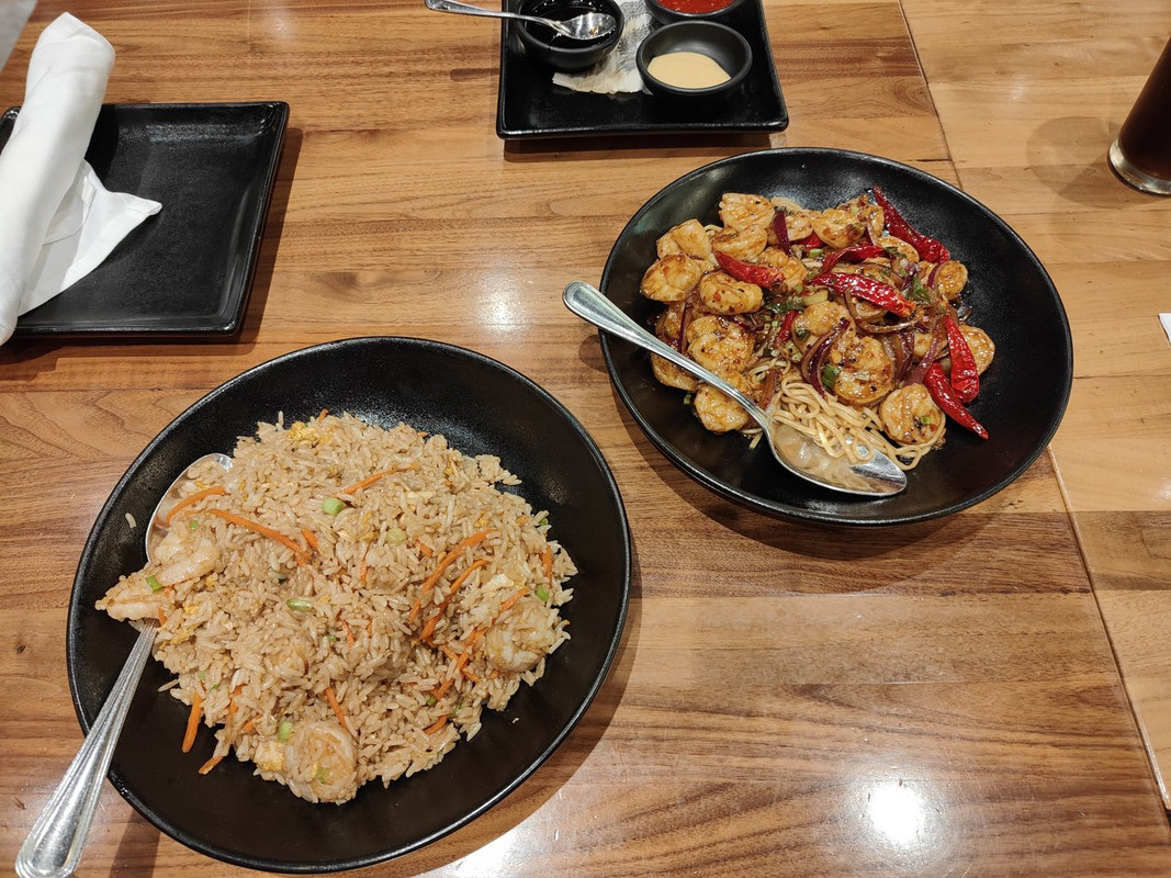 Red Chilli Buttery Shrimp δεξιά (€24) και Chang's Fried Rice w/ Shrimp αριστερά (€13).