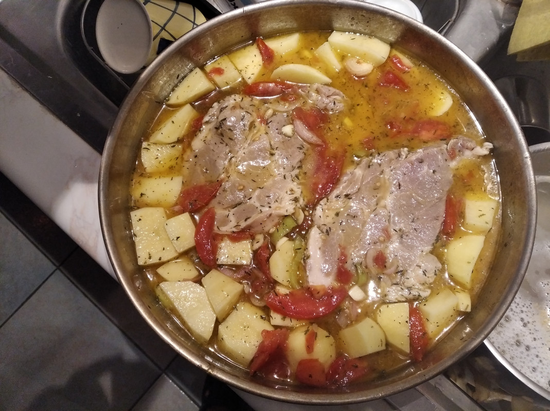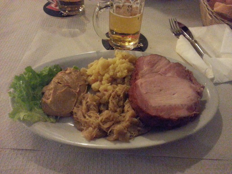 Στη δεύτερη φωτογραφία,μια φέτα χοιρινό με πατάτες και ξινολαχανο