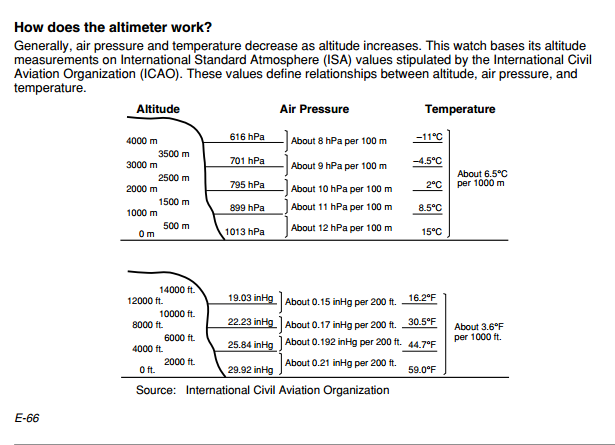 "Τhe watch bases its altitude measurements on International Standard Atmosphere (ISA) values stipulated by ICAO. These values define relationships between altitude, air-pressure and tempereture"