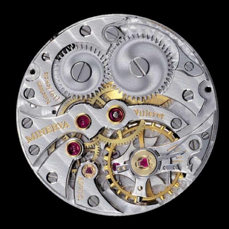 The Minerva Cal. 13-21 (Hour, Minute, Small Seconds with Monopusher Chronograph) was the evolution of the original Calibre 13-20 with its recognisable position of the pusher at 37° from the crown instead of the usual 30° angle. Diameter: 29.5 mm. Parts: 239.