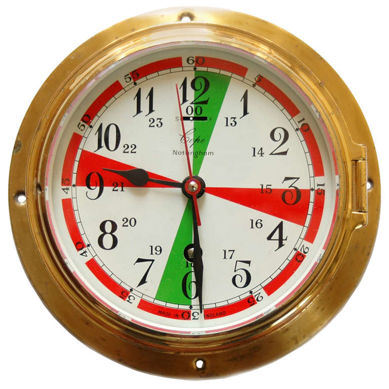 Radio room clocks have traditionally been marked with these silence periods as guidance for the operators. The green sectors on the clock face represent silence periods on the SSB (single side band) distress frequency of 2182kHz, as used by commercial, and some pleasure, crafts. The red sectors are for Morse code distress signals on the 500kHz band, as used in radiotelegraphy.