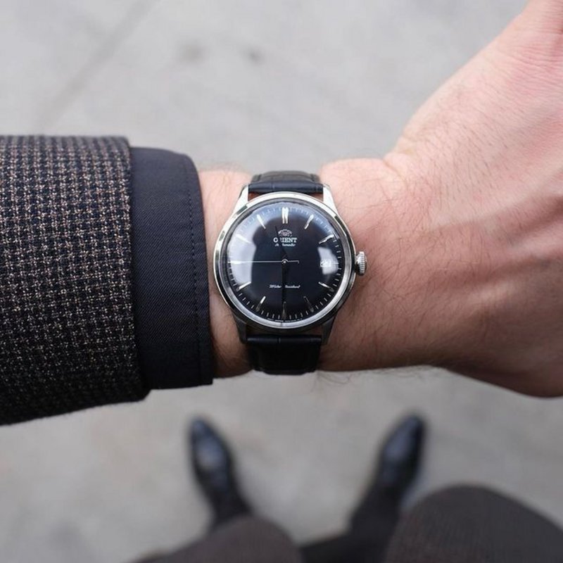 Orient Bambino #fac0000db0. Automatic watch a timeless classic. Stainless steel case, black leather bracelet, sophisticated retro domed crystal and date display