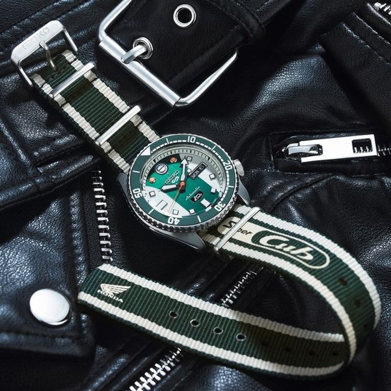 NEW S5 Sports X Honda Super Cub This limited edition timepiece is created in collaboration with Honda Super Cub, the world-renowned urban motorbike, launched in 1958. This collaboration brings Seiko 5 lovers a retro timepiece, echoing the style of the Super Cub 110 bike. The dial, resembling the front of the motorbike, features the Super Cub logo placed exactly as it would be on the bike. The 12 o'clock marker is shaped like the bike's headlight, while the 1 and 11 o'clock indices mimic the indicators. The rider's watch also has a fuel gauge-themed icon on the crown. Watch Featured: SRPJ49