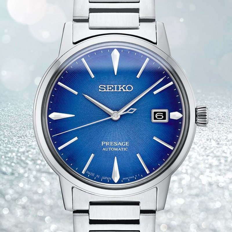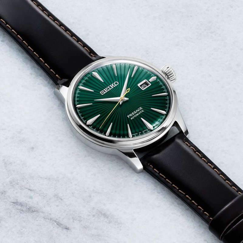 The green sunray dial of the Presage Cocktail Time Automatic #SRPD37 is inspired by the Mockingbird, a warming cocktail with a unique flavor and a refreshing harmony of tequila and mint. Featured on a brown leather strap and equipped with Caliber 4R35, this timepiece radiates sophistication and glamour
