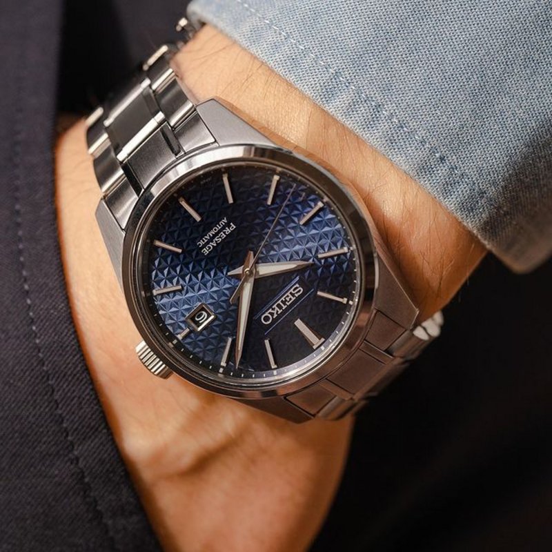 At the forefront of the Seiko Presage Sharp Edged Series is the SPB167, which embodies centuries of refined artisanship and contemporary Japanese design. Energy is the driving theme of the SPB167 dial, with a faceted motif inspired by Asanoha — a complex geometric hemp leaf pattern — that symbolizes prosperity and growth. Rendered in glossy blue, the historic dial pattern comes to life as light dances around the bold, legible, LumiBrite-filled hands and markers. The angular 39.3mm-wide, 11mm-thick, and 47mm lug-to-lug stainless steel case features Seiko’s proprietary super-hard coating and houses the 6R35 automatic movement visible through the see-through caseback. With 70 hours of power reserve, 100m water resistance, and an elegant stainless steel bracelet, the Seiko Presage Sharp Edged SPB167 is capable and versatile on the wrist
