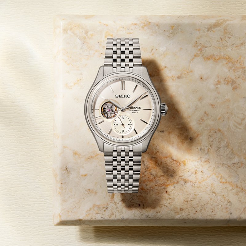 The Presage Star Bar SRE015 is a breath of fresh air for those who are desperate for thoughtfulness and creativity in feminine watches. Rather than having more mother-of-pearl thrust upon us, Seiko has created this dial to evoke a sense of Tokyo nightlife. The smokey darkness around the perimeter and the cool grey lighting practically transports you to a high-end cocktail bar, and the scuffed texture that creates dancing highlights is supposed to appear like ice in a drink.