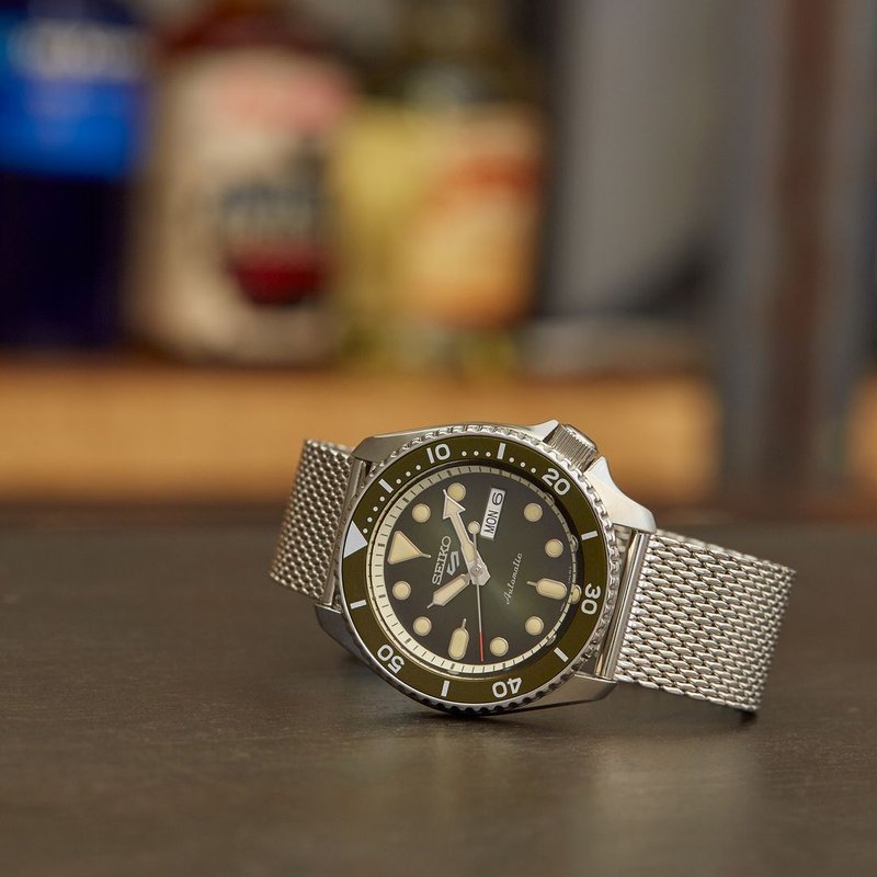 The quality of Seiko’s bracelets has improved immeasurably over the last decade, and this one looks particularly beautiful. Its elongated three-link design accentuates the way the width tapers down to the butterfly clasp, which is also milled. The connecting links are brushed for a bit of textural interplay between the rows, and the open space between them promotes more of a jewellery feel than a solid slab of metal. If you’d prefer to wear it on a leather strap or another alternative, the 14mm lug width is more versatile and easy to shop for than you’d think.