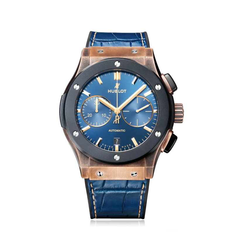 Movement is the Swiss automatic Hublot in-house caliber HUB1143 Unico with 59 jewels, 28,800 vph and a power reserve of 42 hours. Flyback chronograph movement with column wheel.
