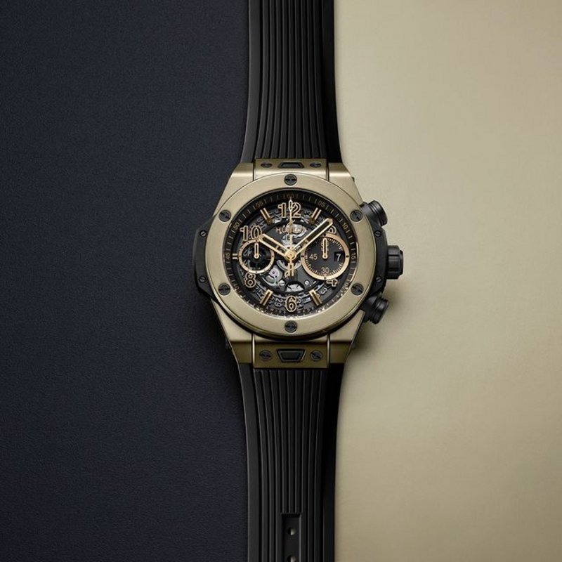 For the Big Bang Unico Full Magic Gold, Hublot has used this innovative alloy on both the case and the bezel, allowing the gold hue to shine across the watch. The gold colour is referenced in the satin-finished and microblasted 3N gold of the indicies, counters and hands, while the deep, dark black of the pushers, guards, screws and rubber strap contrast with the case itself.