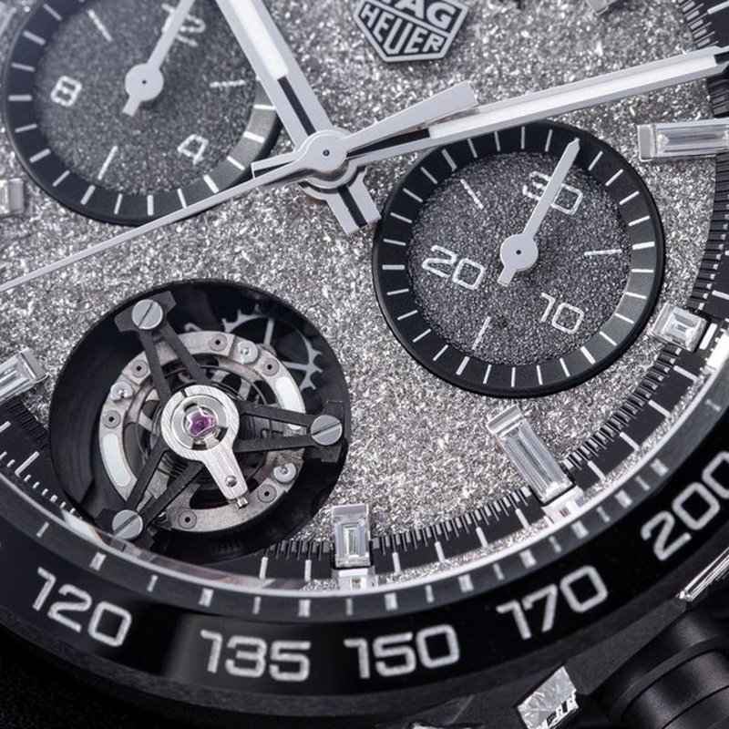 tagheuer 's avant-garde approach to watchmaking, expressed here with the clever use of synthetic diamond for the dial, hour markers, and crown