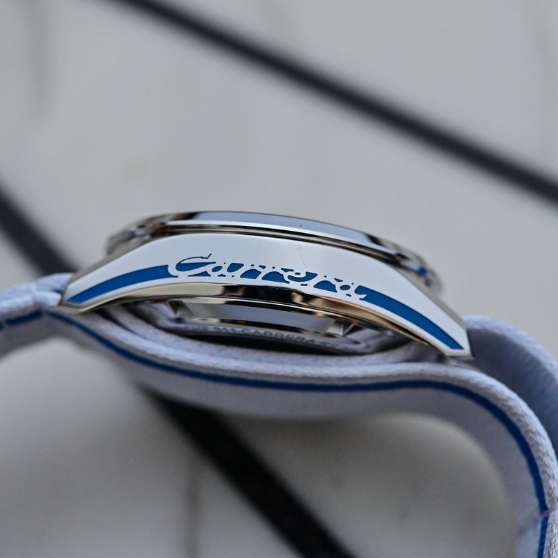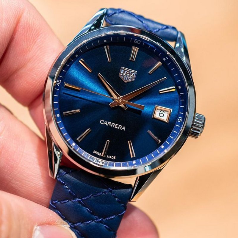 This audacious haute-couture TAG Heuer Carrera lady for women seeking chic luxury style. The brushed blue dial inside the steel case glows with rose gold indexes and hands. The 36mm case is a true work of art with a fixed steel bezel and held on the wrist by a calfskin strap in a navy blue