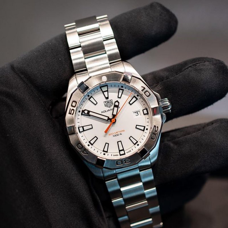Take a dip into summer this year with the TAG Heuer Aquaracer. This handsome diver’s watch combines finely brushed steel with polished bevels and features a pure white dial. The indices are as clear as they can get with black outlining and the striking orange pops out against the otherwise monochromatic timepiece. A sporty watch in every regard, this timepiece is comfortable with a business suit or a bathing suit