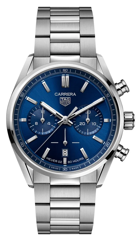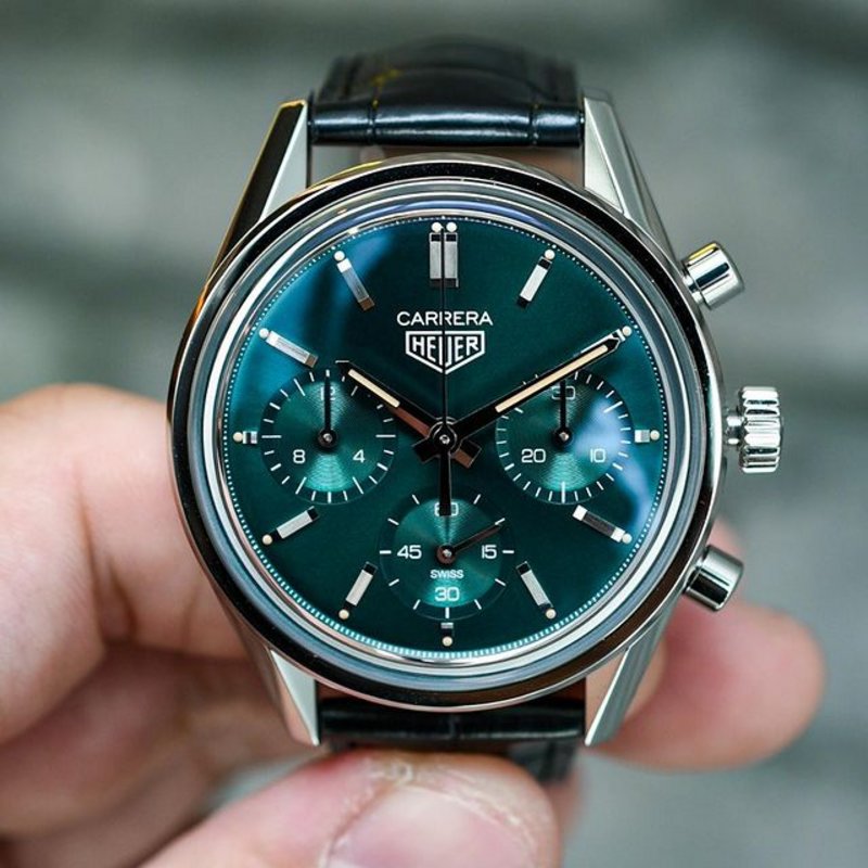 Introducing the new TAG Heuer Carrera Calibre Heuer 02. This special edition sports a gorgeous teal green dial in its proportionate 39mm case. Limited to just 500 pieces worldwide, this unique piece is reminiscent of iconic Heuer chronographs. The robust Heuer 02 calibre powers this watch, running for a full 80 hours of power reserve. The domed sapphire crystal improves legibility whilst giving the watch the charismatic charm of classic Heuer design