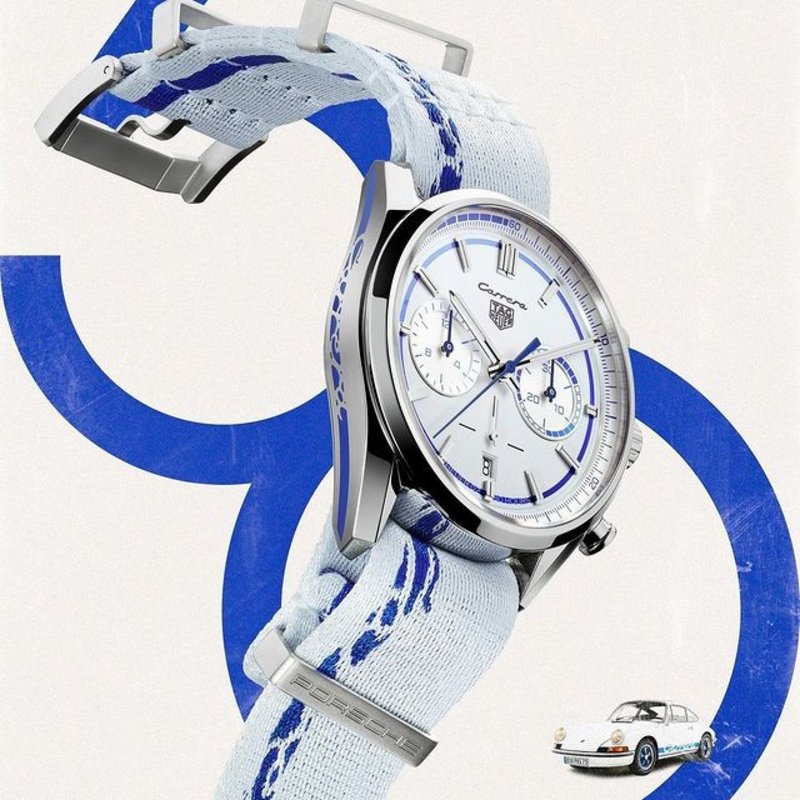 To celebrate 50 years of the iconic Porsche 911 Carrera RS 2.7, Porsche collaborated with #TAGHeuer to create the TAG Heuer Carrera X Porsche Limited Editions. Released in two variants with blue and red accents, this watch features a white dial, carrera logo engraved on the edge of the case and is paired with white Nato lacing for the blue model, and leather lacing for the red model