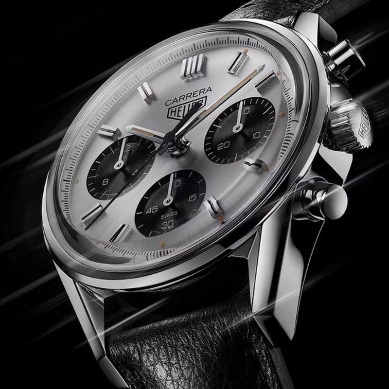 The “curtain-raiser” to the birthday celebrations is the reissue of a model coveted by collectors, the Heuer Carrera reference 2447 SN – featuring eye-catching “panda” colourways, ie: black sub-dials out of a silver face. (SN stood for ‘silver’ and ‘noir’, and was part of a run featuring five contrasting dials. In the spirit of watch fans giving models funny nicknames, this one is sometimes referred to as ‘Big Eyes’.)
